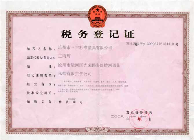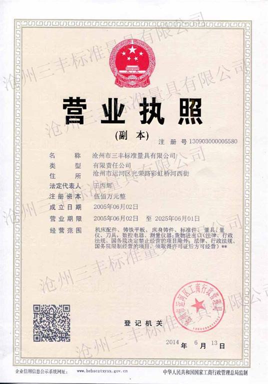公司名稱:滄州市三豐標準量具有限公司 公司地址:河北省滄州市華西工業區三號 電話:0317-3522080 傳真:0317-3522080 手機:13832708800 公司網址:
